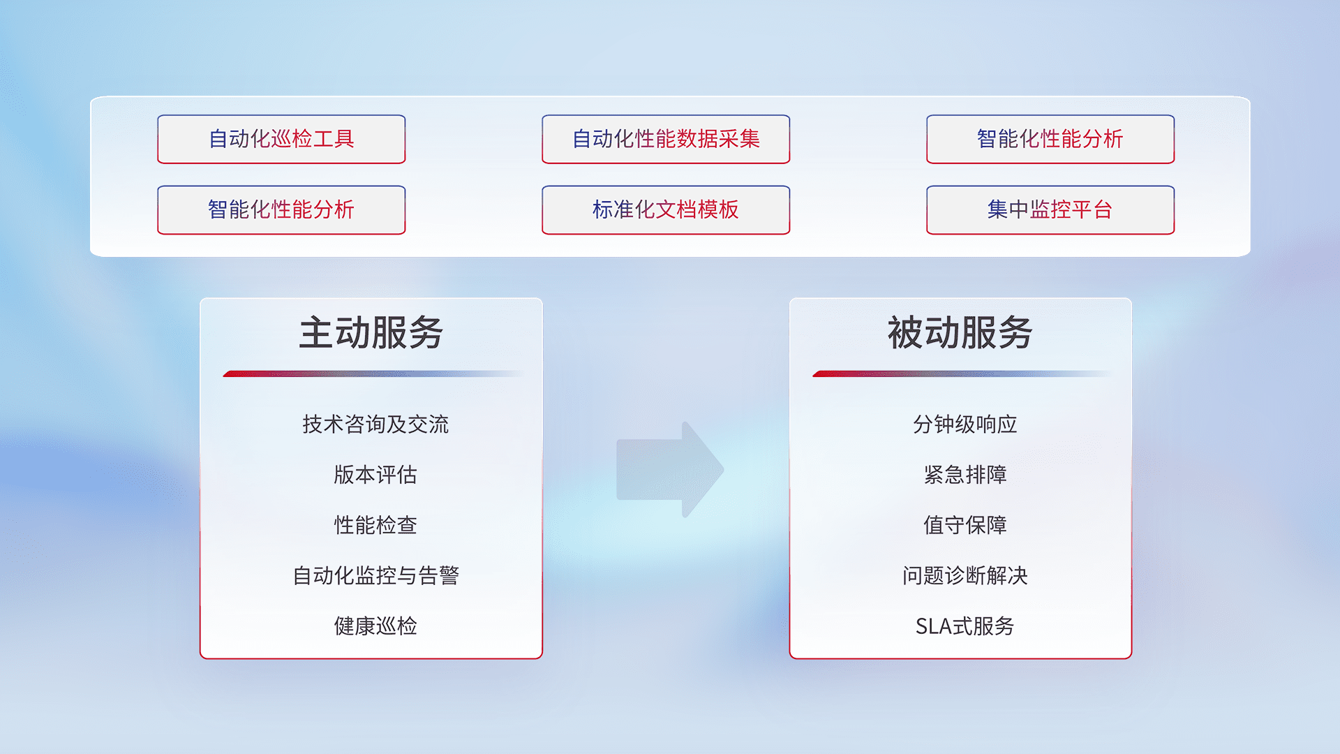 智能化工具和标准化文档,,,,保障服务质量,,提供主动服务(包含技术咨询、、版本评估、、、性能检查、、、自动化监控与告警、、健康巡检)和被动服务包含(分钟级响应、、紧急排障、、值守保障、、问题诊断解决、、、SLA服务)。。。