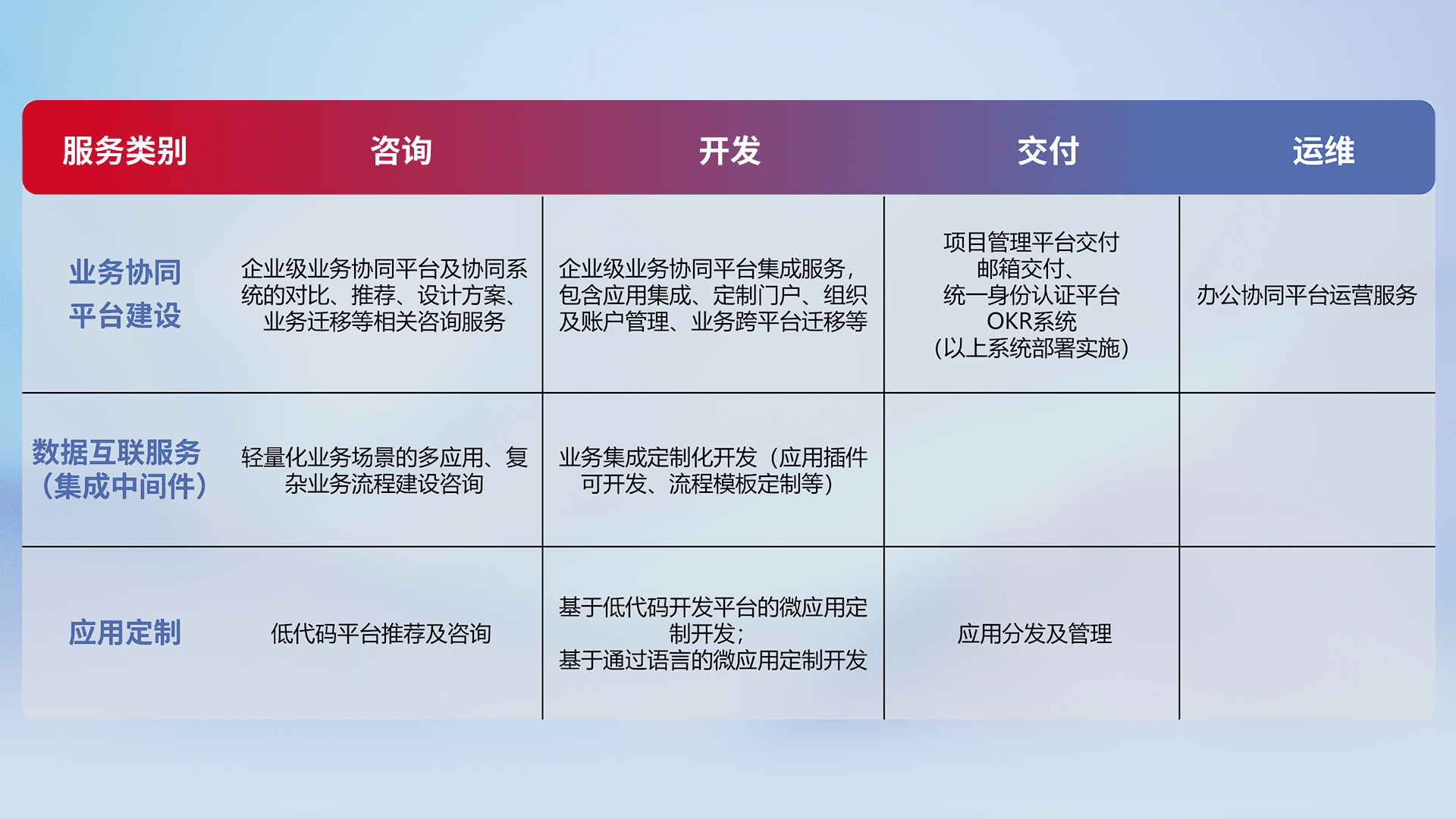 针对钉钉、、、企微、、IDaas等平台级产品提供产品的规划、、、方案、、交付、、、、定制化开发等服务,,,,实现如统一协同办公、、、、智能客户服务、、混合会议管理、、、、智能数据查询、、、、等业务场景,,实现数字化转型。。。。